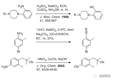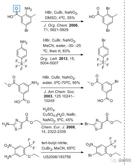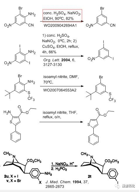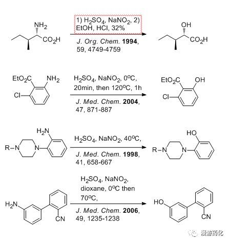 另外,該反應(yīng)與變成羥基的試劑咋看很類似,區(qū)別就是前者是在硫酸的水溶液加熱發(fā)生羥基取代,后者是在濃硫酸的環(huán)境中脫除反應(yīng),或是有硫酸銅或銅粉的催化,或是在亞磷酸的還原氣氛中脫除。