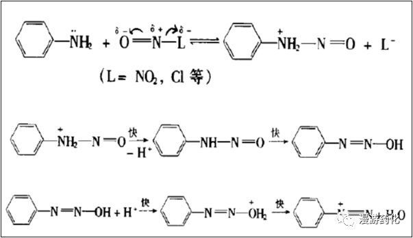 芳胺的重氮化反應(yīng)需經(jīng)2步,首先是親電試劑進(jìn)攻芳胺氮原子生成不穩(wěn)定的中間產(chǎn)物,然后不穩(wěn)定中間產(chǎn)物迅速分解,整個(gè)反應(yīng)受第一步控制。無(wú)機(jī)酸不同,參與重氮化反應(yīng)的親電試劑也不同。稀硫酸中參與反應(yīng)的是N2O3(一為不穩(wěn)定結(jié)構(gòu)ONONO,一為穩(wěn)定結(jié)構(gòu)ONNO2),鹽酸中參與反應(yīng)的是亞硝酰氯NOCl;在濃硫酸中則是亞硝基正離子N+O。他們的親電性強(qiáng)弱順序?yàn)? N+O>NOCl>N2O3