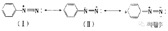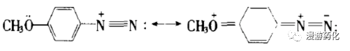 重氮鹽的氮原子為sp雜化,當(dāng)重氮離子與芳烴相連,芳環(huán)的大π鍵與重氮基的π鍵共軛,使得其穩(wěn)定性較脂肪族重氮鹽的高。由于共軛效應(yīng)影響,單位正電荷并不完全集中在一個(gè)氮原子上,共振式如下: