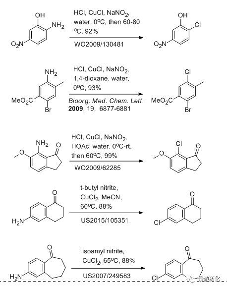 對(duì)于重氮鹽生成鹵代芳烴和腈基化合物的反應(yīng),其機(jī)理還沒(méi)有完全搞清楚,一般我們認(rèn)為是一個(gè)自由基反應(yīng),苯環(huán)上的取代基(如羥基,烷氧基,酰基,羧基,硝基和鹵素等),無(wú)論是吸電子基團(tuán)還是供電子基團(tuán),對(duì)反應(yīng)都沒(méi)有特別的影響,氯代必須用CuCl/HCl 體系,溴代則要用CuBr/HBr 體系,碘代則一般用鹽酸做重氮鹽,不用Cu 鹽催化,直接加KI或NaI 就能得到碘苯。