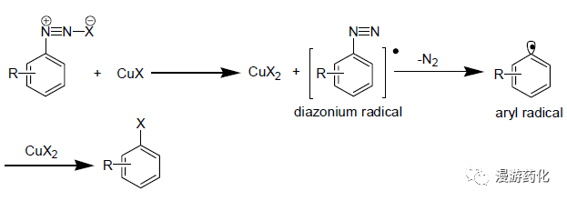氯離子和溴離子的親核能力較弱,因此用同樣的方法很難將氯、溴引入苯環(huán)。1884年,Sandmeyer發(fā)現(xiàn)在氯化亞銅或溴化亞銅的催化下,重氮鹽在氫鹵酸溶液中加熱,重氮基可分別被氯和溴原子取代,生成芳香氯化物或溴化物,這一反應(yīng)稱為Sandmeyer反應(yīng)。
