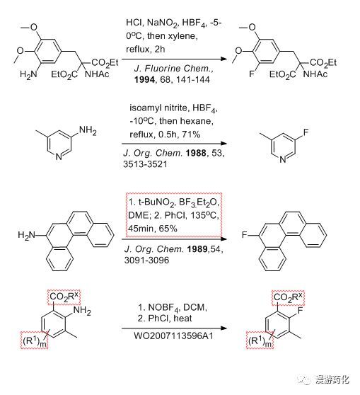 1927 年,同樣是德國(guó)的化學(xué)家G.Balz和G.Schiemann發(fā)現(xiàn)直接加熱苯胺的硼氟酸重氮鹽能得到氟苯,這就是Balz-Schiemann反應(yīng)。